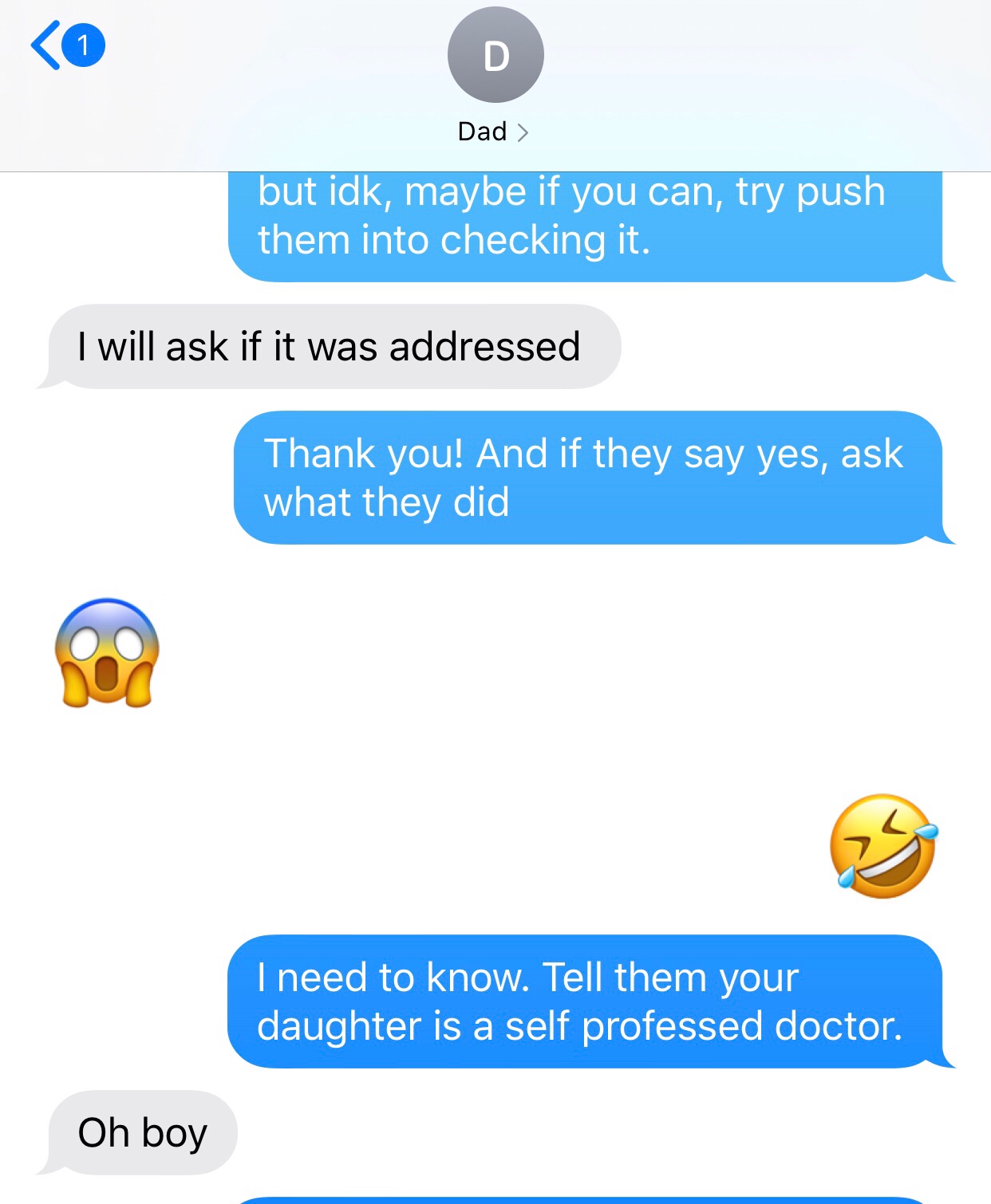 An example of our texts. I would get him to ask the doctors questions for me. 🙂