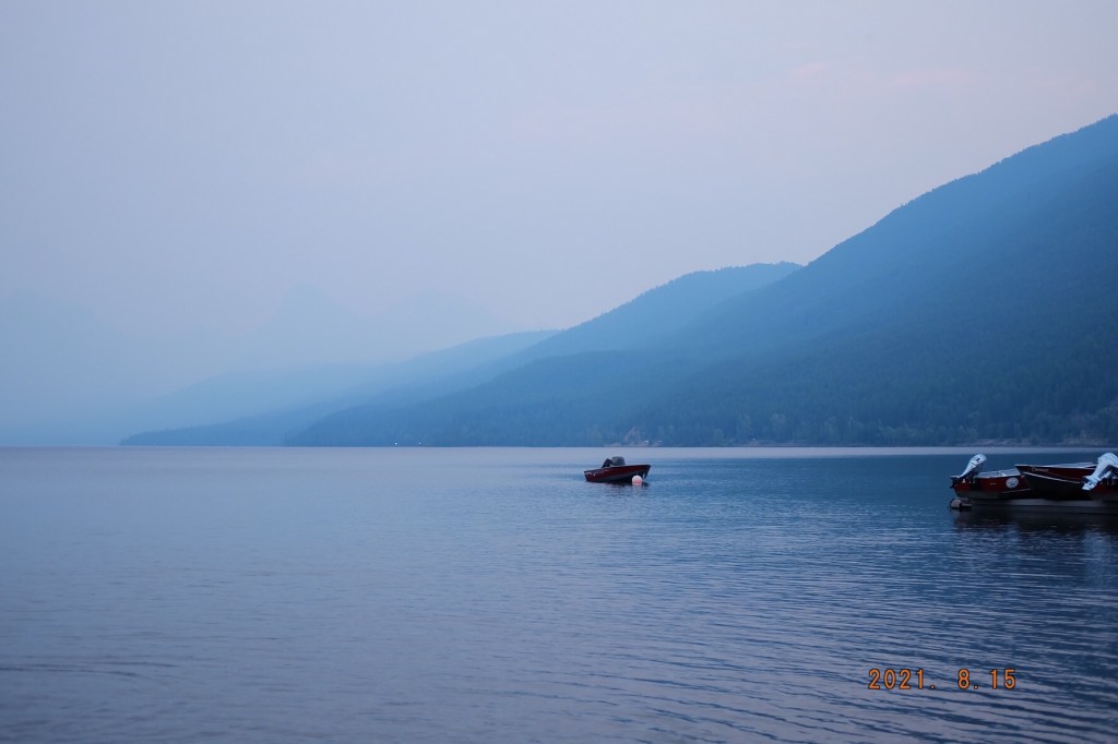 For the evening, we drove up to Glacier National Park, fifteen minutes from Columbia Falls, and just hung out by the shore of Lake McDonald. The kids swam and had a blast. I had hoped to get some pretty sunset photos, but the skies were too smoky so there wasn’t much.