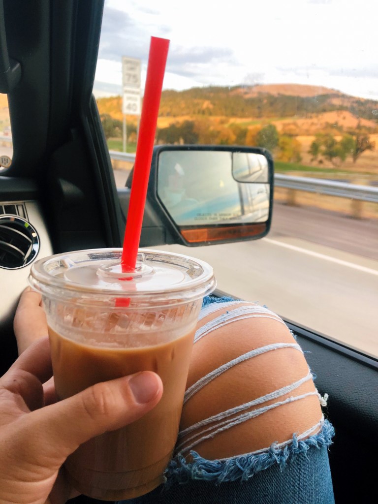 First stop upon arrival to the Badlands area, was City Brew coffee in Spearfish. Always the first stop. I got an iced huckleberry white mocha, which was so good. I always get my drinks half sweet and it’s perfect. And notice the gorgeous fall colors out the window! 😍