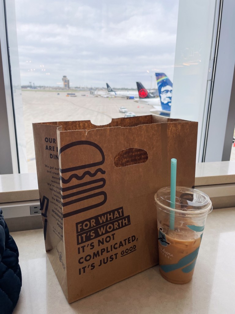 My new sister in law who lives in the same town as me was my travel companion! We hopped the mini delta connection plane (what an experience!) from here and had a 1.5 hour flight to Minneapolis for a 4 hour layover. We sat and enjoyed burgers from shake shack and a couple caribou coffees while waiting for my mom and sisters!